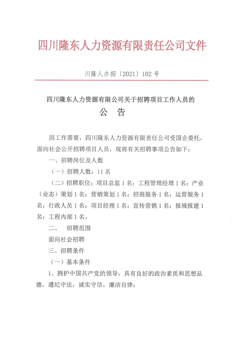 四川隆東人力資源有限公司關(guān)于招聘項目工作人員的公告
