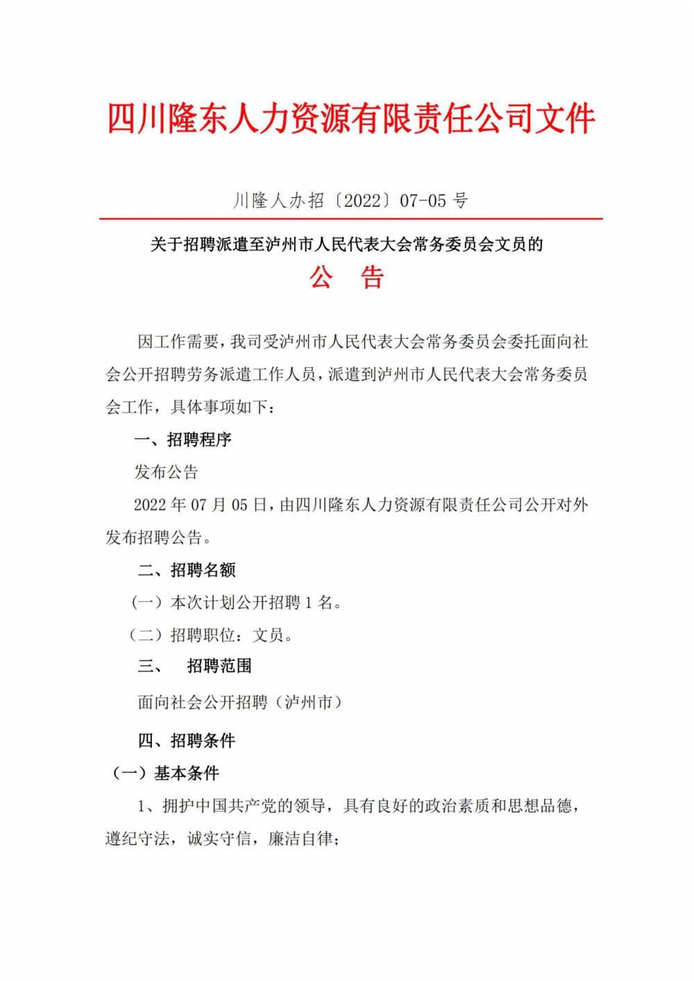 關(guān)于招聘派遣至瀘州市人民代表大會(huì)常務(wù)委員會(huì)文員的公告